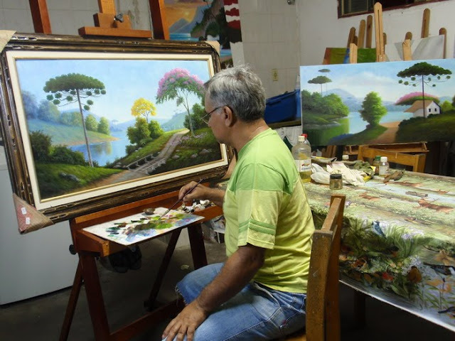 Aula de pintura, óleo e acrílico sobre tela,estilo acadêmico.